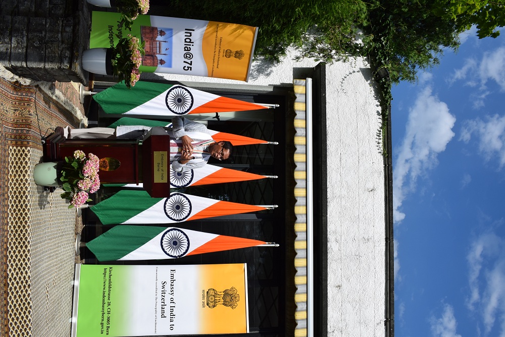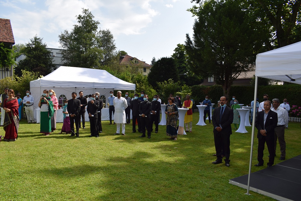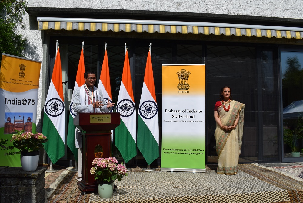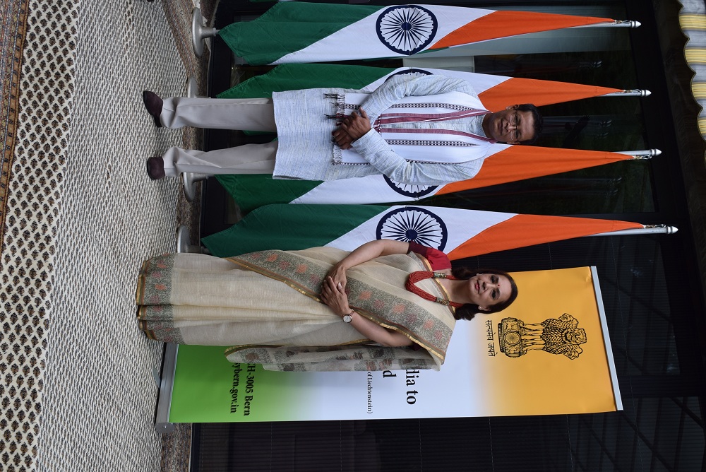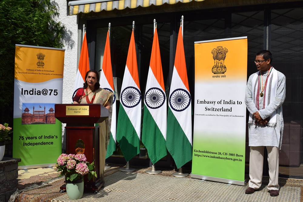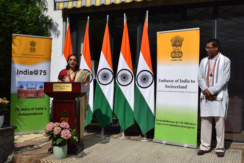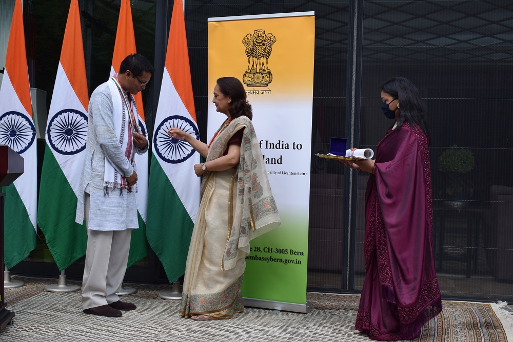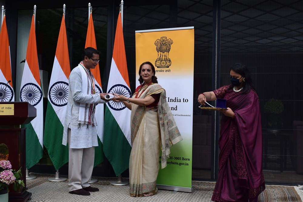 Ambassador Monika Kapil Mohta presented the Pravasi Bharatiya Samman Award medal and certificate to Dr. Shachi Gurumayum, NRI from Switzerland who received this honour for his achievements in the field of Bio-tech Agronomy.