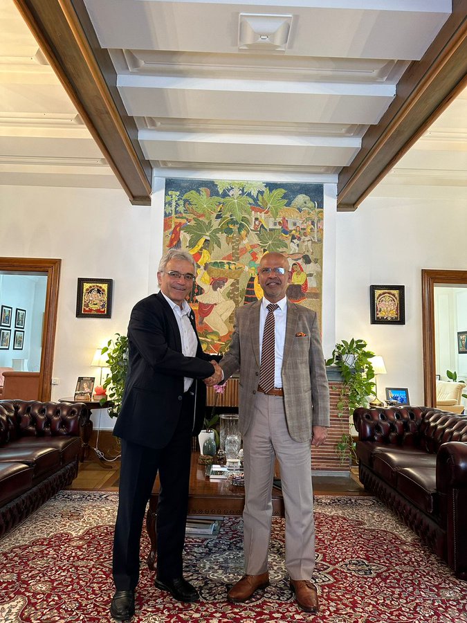 Ambassador Mridul Kumar received Mr. Andreas Blinkert, President of 2000-Watt-Smart-Cities Association at India House on 18 June 2024. They discussed ongoing projects in Pune and other cities and ways to mitigate adverse effects of climate change in India through implementation of the concept.