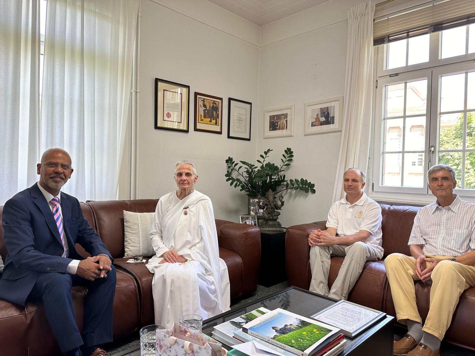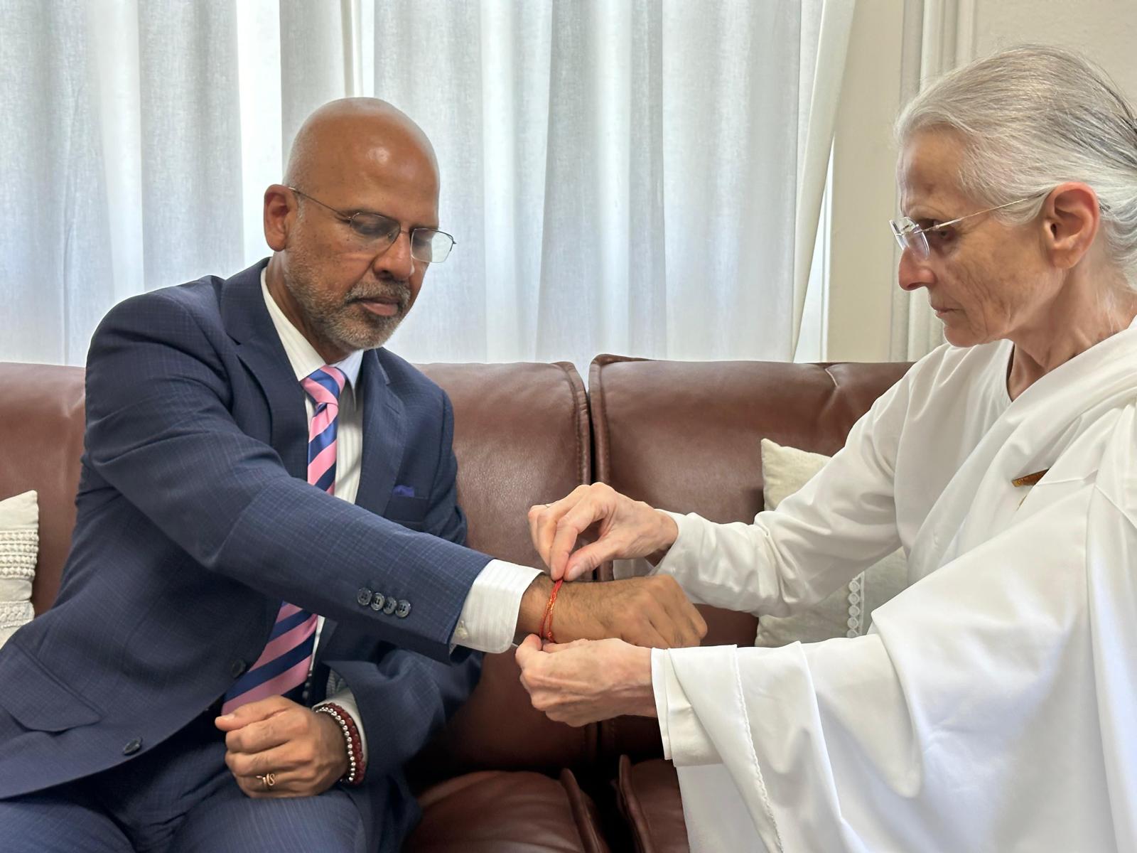 President of Brahma Kumaris, Switzerland Mr. Luca Campana and Didi Guddi tied rakhis to Ambassador Kumar and other Embassy officials at the Chancery on 06 August 2024, reaffirming bonds of friendship between the Embassy and the Brahmakumaris. Embassy’s strong ties with the Brahmakumaris manifest in jointly holding International Day of Yoga & other community events in Switzerland.