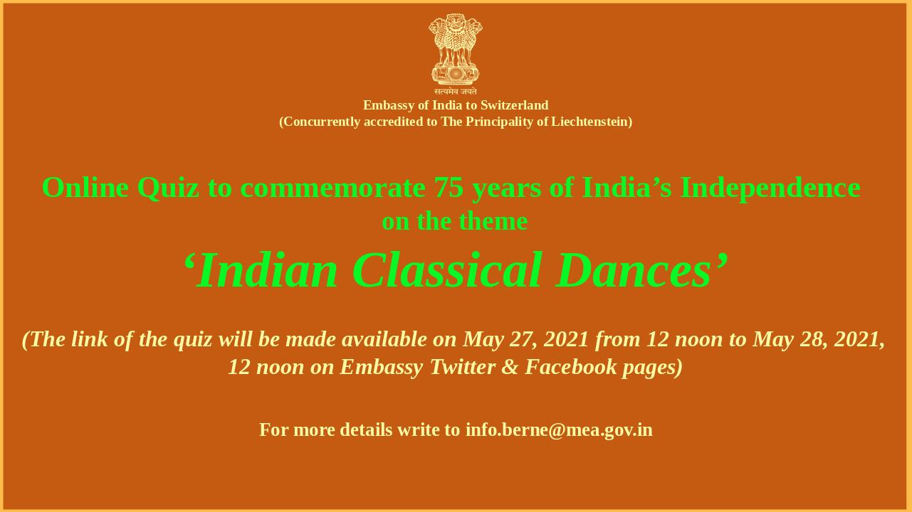 3rd Online Quiz to commemorate 75 years of India's Independence, on the theme 'Indian classical Dances'. Quiz will be open till May 28, 1200 hrs.