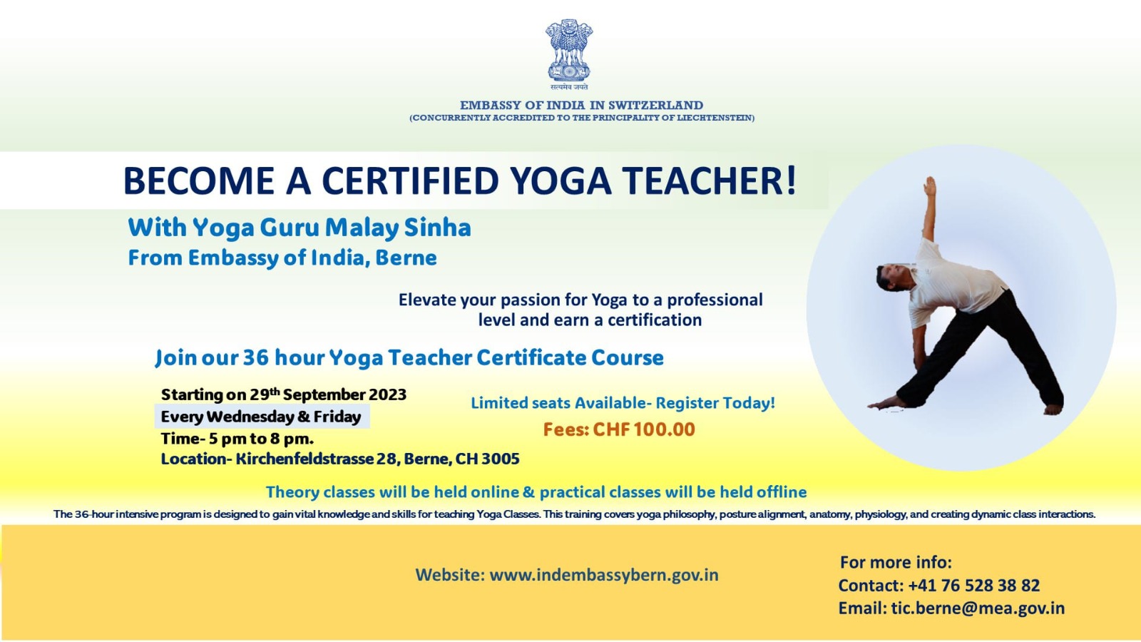 Become a Certified Yoga Teacher by joining the 6-week intensive yoga training programme offered by Embassy of India, Berne.