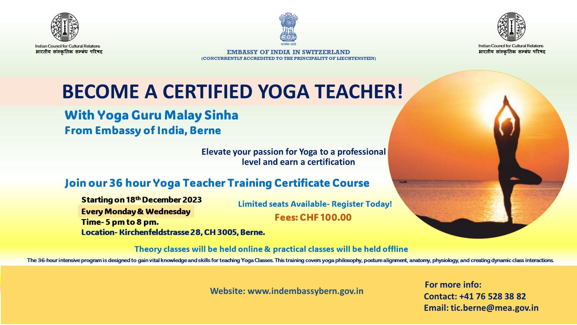 Become a Certified Yoga Teacher by joining the 6-week intensive yoga training programme offered by Embassy of India, Berne.