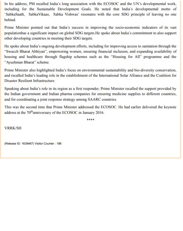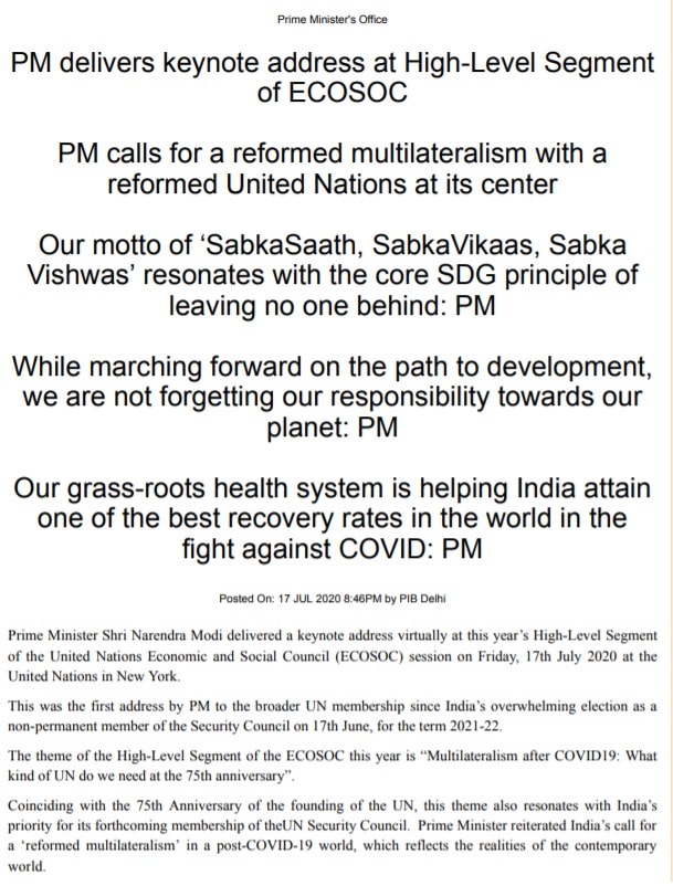 Press Release on Hon'ble Prime Minister's keynote address at the High-Level Segment of United Nations Economic and Social Council (ECOSOC) session on 17th July 2020.