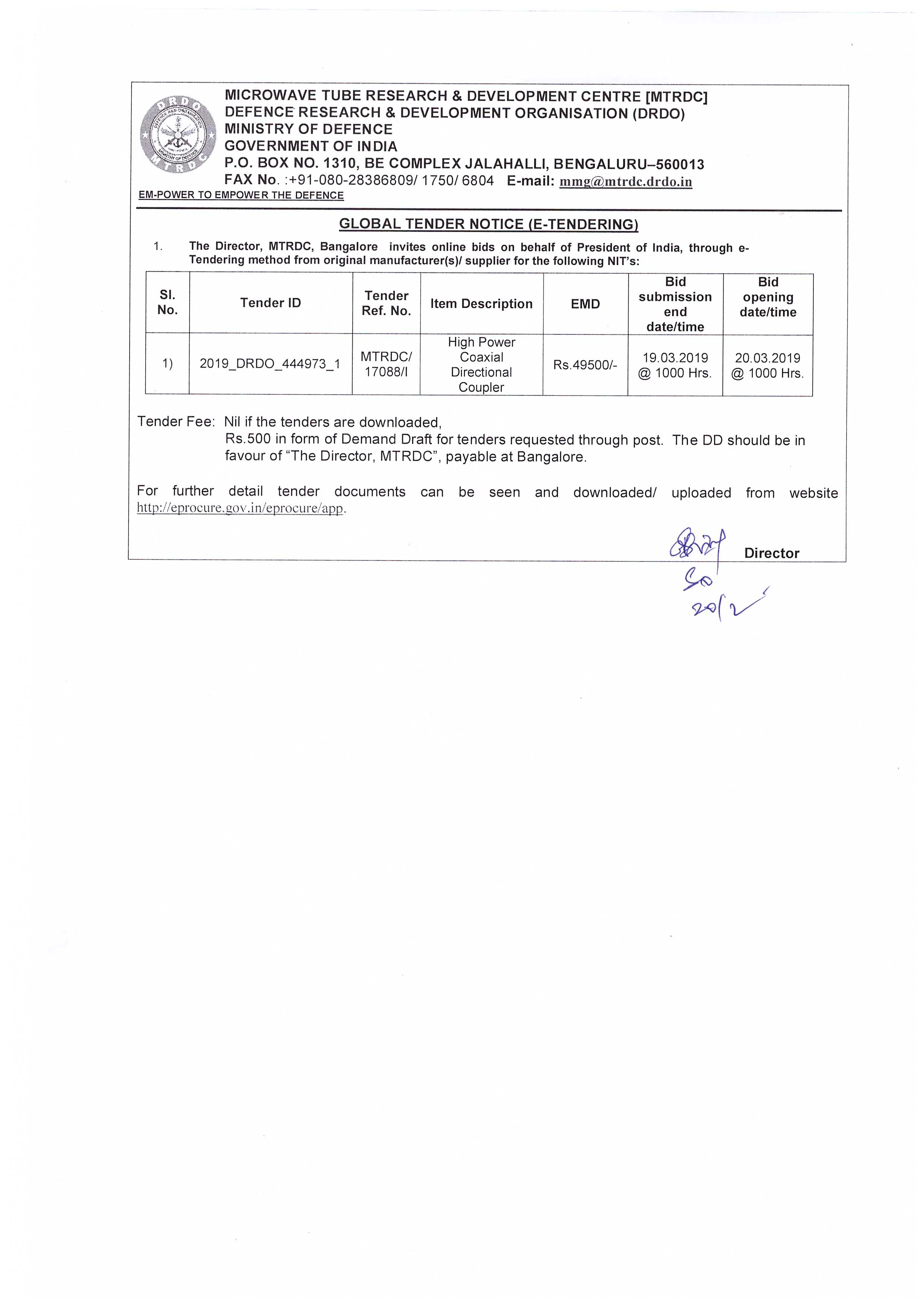 MRTDC, DRDO, Bengaluru / Tender ID 2019_DRDO_444973_1 / Procurement of High Power Coaxial Directional Coupler / Due Date 19.03.2019