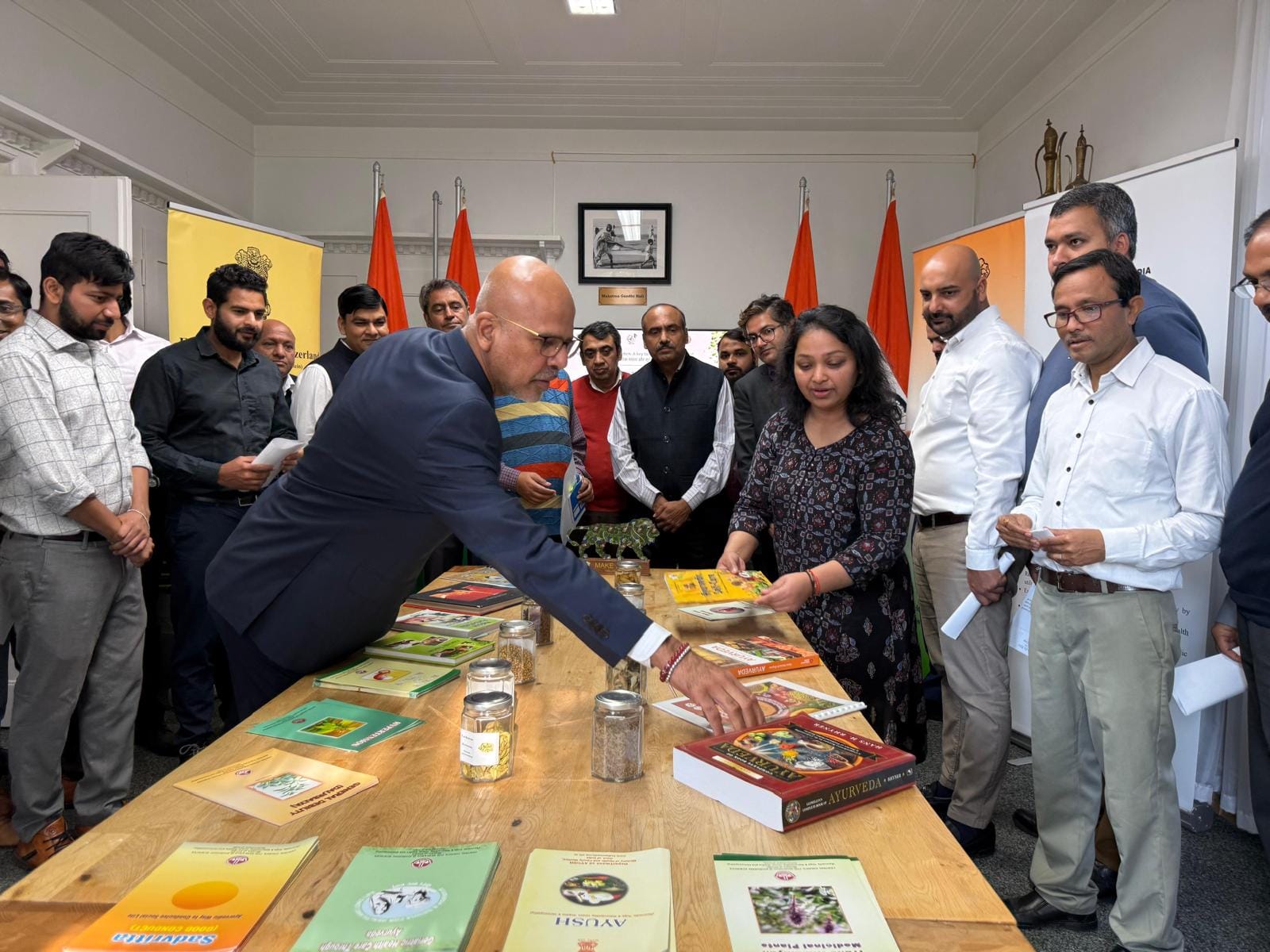Commemorating the 9th Ayurveda Day 2024, Embassy of India, Berne organized an Ayurveda and Wellness exhibition on 29 October 2024 with the theme "Ayurveda innovation for Global Health". At the event, an Ayurveda exhibition showcasing the benefits of this time-tested Indian traditional practice, was on display. Ambassador Mridul Kumar administered the ‘Ayurveda Day Pledge’ to all Embassy officials and emphasized the relevance of Ayurveda for holistic well-being including at workplace. Video of Hon’ble Prime Minister Shri Narendra Modi, launching, inaugurating and laying the foundation stone of Multiple Health Sector Projects on Dhanvantari Jayanti and 9th Ayurveda Day was screened at the event.