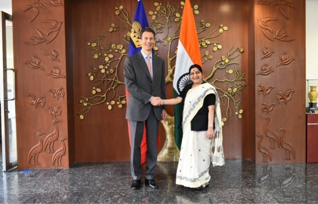 Meeting of External Affairs Minister, Ms. Sushma Swaraj with His Serene Highness the Hereditary Prince of Liechtenstein, Alois Phillip Maria.