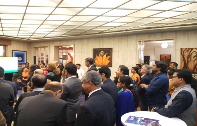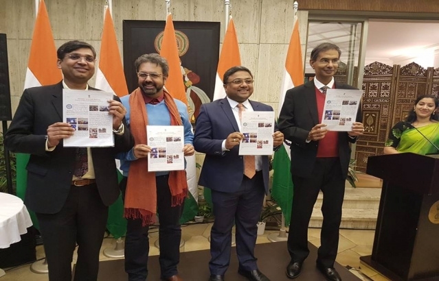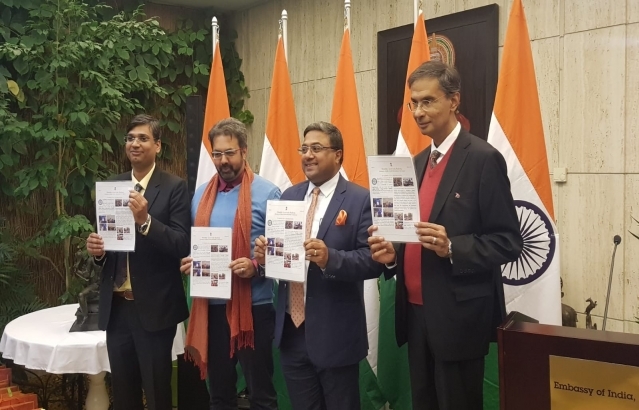 Ambassador Sibi George along with Swiss Member of Parliament Nik Gugger, President of SwissIndian Chamber of Commerce Philippe Reich & First Secretary Dr.Piyush Singh releasing the secondedition of Ayurveda Bulletin on Jan 9 in Bern.