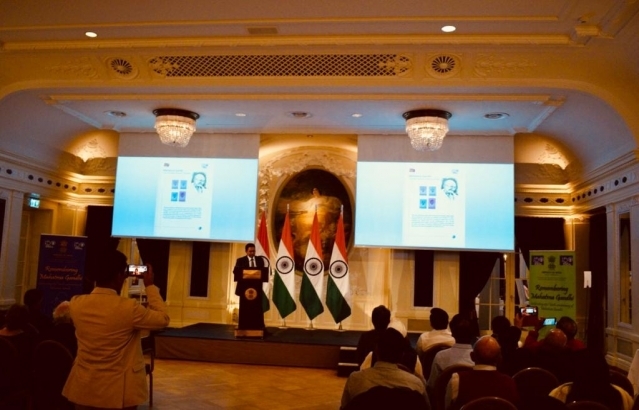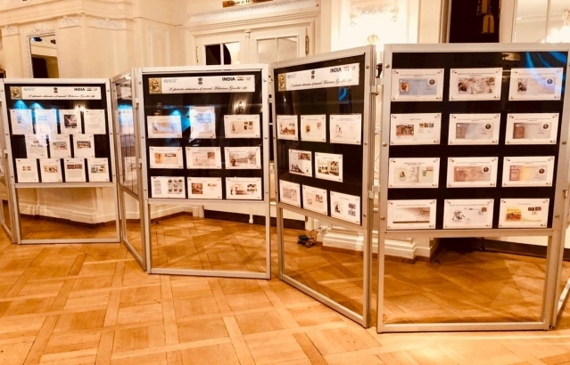 Glimpses of philately exhibition on Mahatma Gandhi held at Hotel Bellevue Palace in Bern on Feb 28.