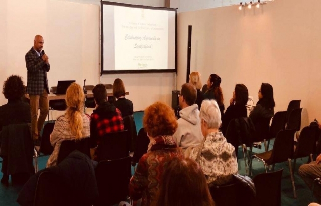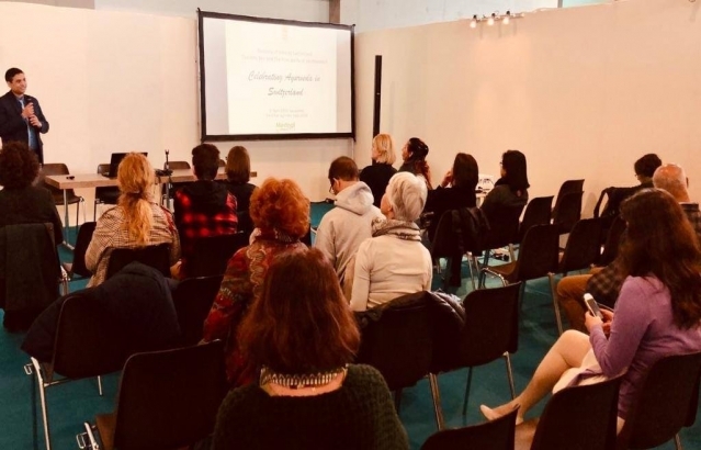 The overwhelming response to a session on AYURVEDA organized by Embassy of India at MEDNAT AGROBIO EXPO in Lausanne on April 6. Dr Piyush Singh, First Secretary with Dr Geetha Krishnan, Technical Officer, WHO at the session.