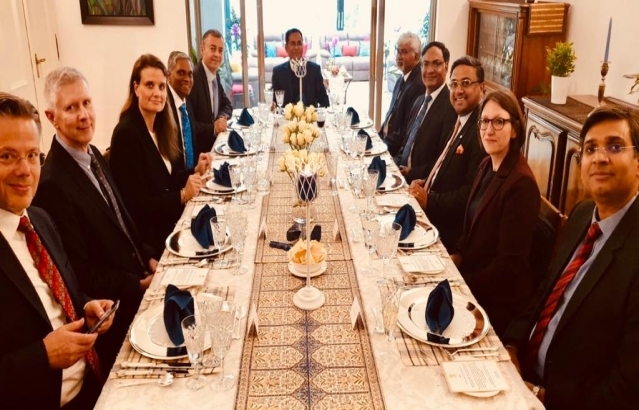 Amb Sibi George with Indian and Swiss delegations for the Joint Working Group Meeting on Science & Technology headed by State Secretary of SERI Prof (Dr.) Martina Hirayama and Secretary, Dept of Science & Technology of India Prof Ashutosh Sharma on April 30 at India House in Berne.
