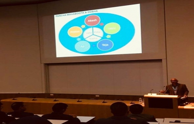 Opening remarks by Amb Sibi George and presentation by Dr. Geetha Krishnan,WHO scholar and renowned Ayurveda practitioner at a Symposium on Ayurveda at Inselspital University Hospital in Berne on May 6 with participation of students and faculty.