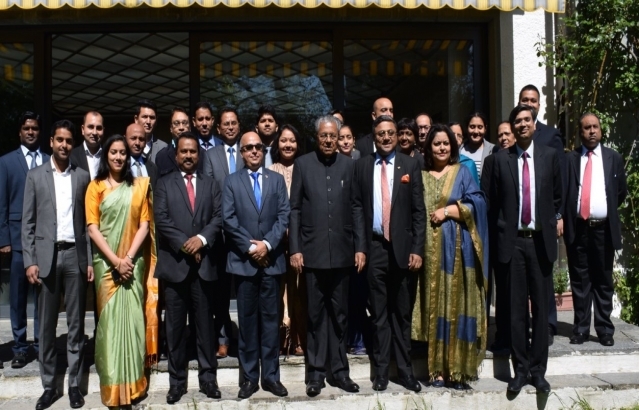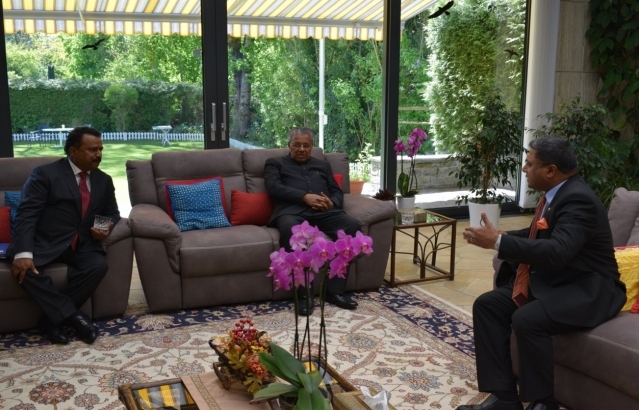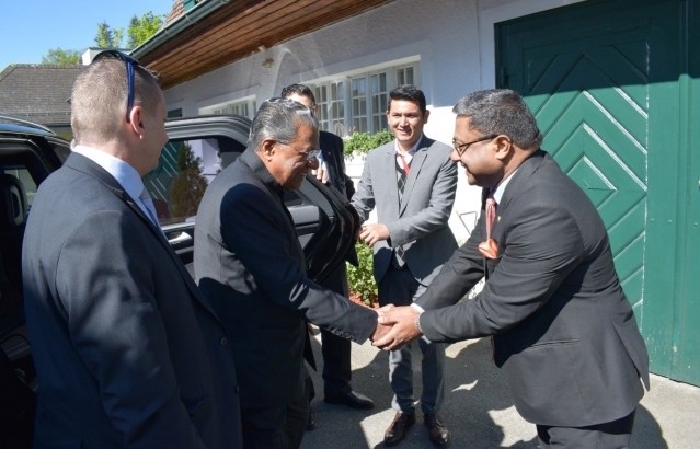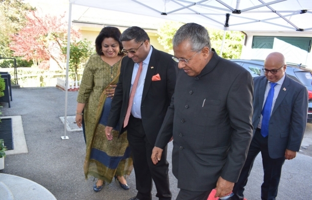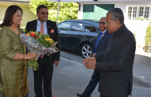 Hon'ble Chief Minister of Kerala Shri. Pinarayi Vijayan being received atIndia House, Residence of Ambassador of India to Switzerland, The HolySee and Liechtenstein, Shri. Sibi George in Bern, Switzerland on May 14,2019. He attended a presentation on India Swiss relations and alsointeracted with the officials of the Mission.
