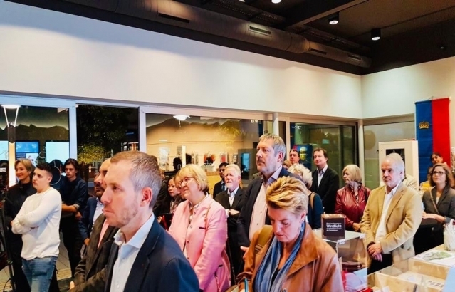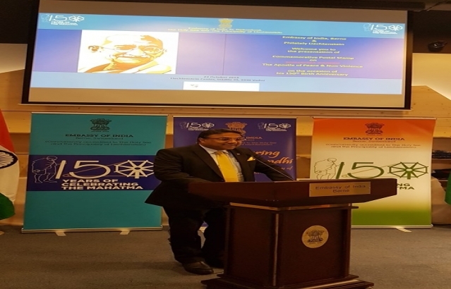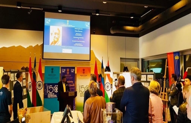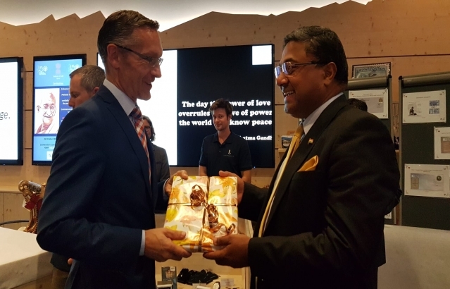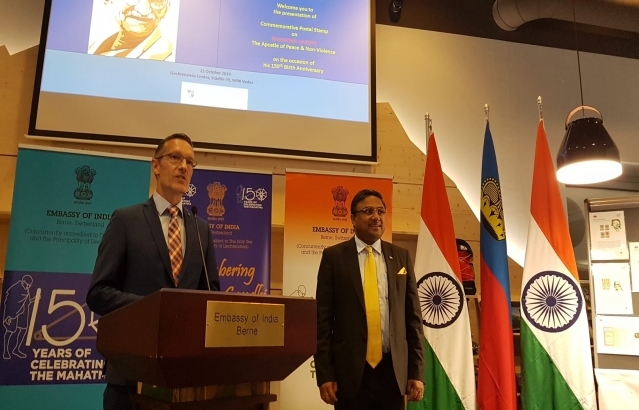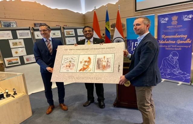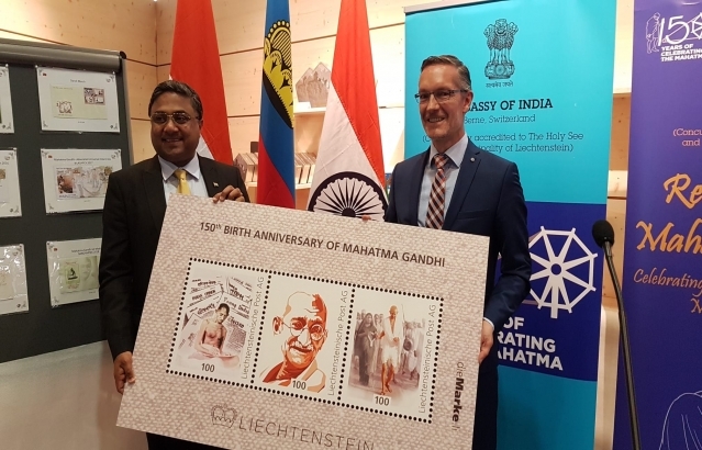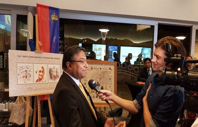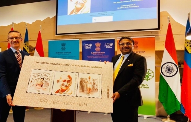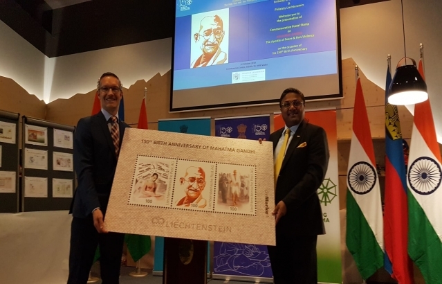 COMMEMORATIVE STAMP ON MAHATMA GANDHI IN LIECHTENSTEIN: Glimpses of release of commemorative stamp on Mahatma Gandhi by Philately Liechtenstein in Vaduz onOct 22. Jointly released by Amb Sibi George and HE Mr Roland Seger, CEO of Liechtenstein Post.