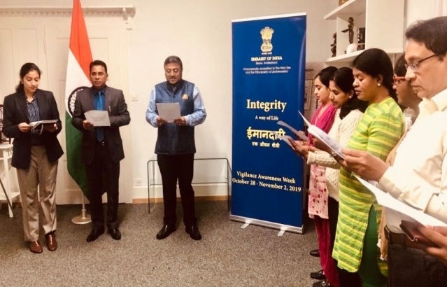 Integrity Pledge at Embassy of India in Berne on Oct 28 on the occasion of Vigilance Awareness Week 28 October - 2 November 2019. Integrity - A Way of Life