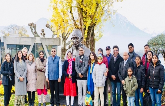 Hon'ble Health Minister of Kerala, Smt. K.K.Shailaja Teacher accompanied by Amb Sibi George and senior officials of Govt. of Kerala paying floral tributes at Gandhi Statue in Villeneuve, Switzerland on Nov 23. Indian Diaspora members sang Gandhi bhajans on the occasion.