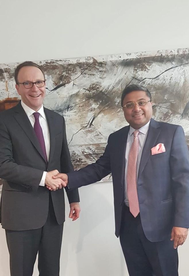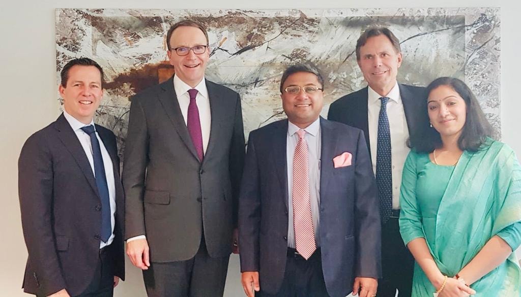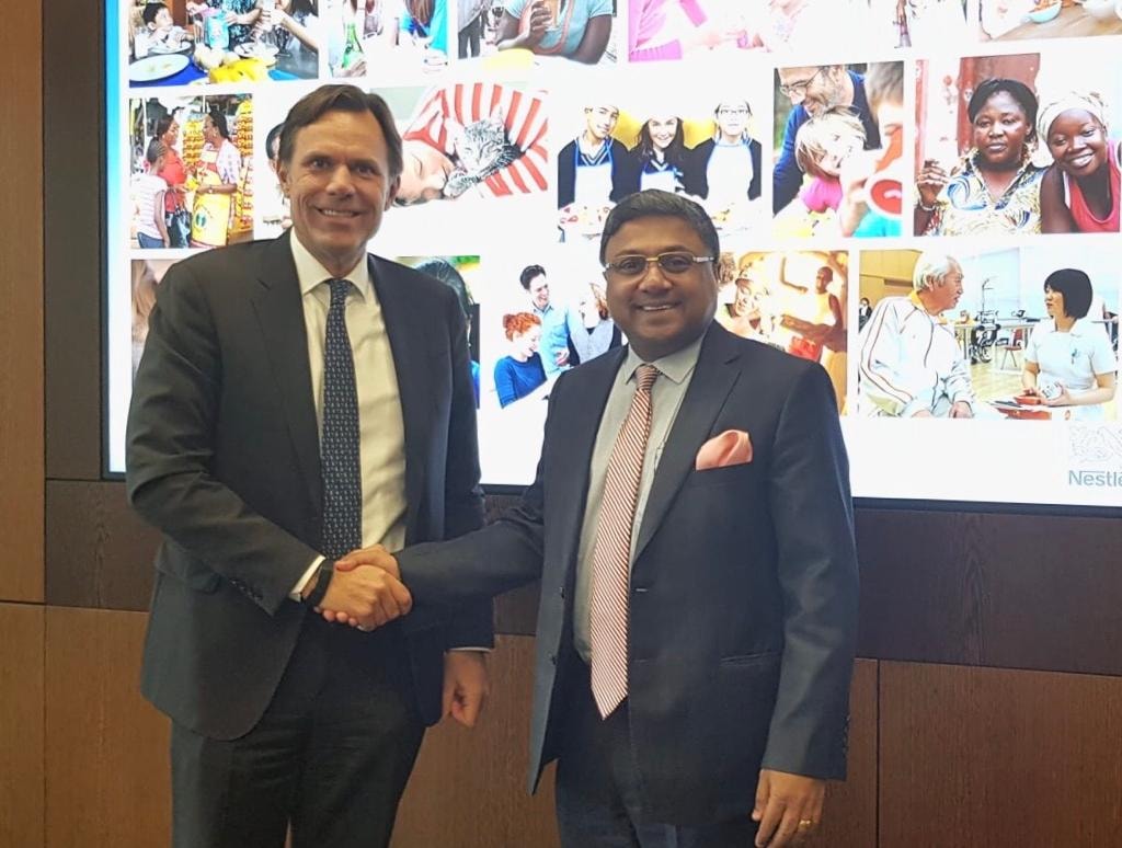 Ambassador Sibi George with Mr Mark Schneider, CEO of Nestlé S. A, and Nestlé team at its Global Headquarters at Vevey in Switzerland on Jan 29.