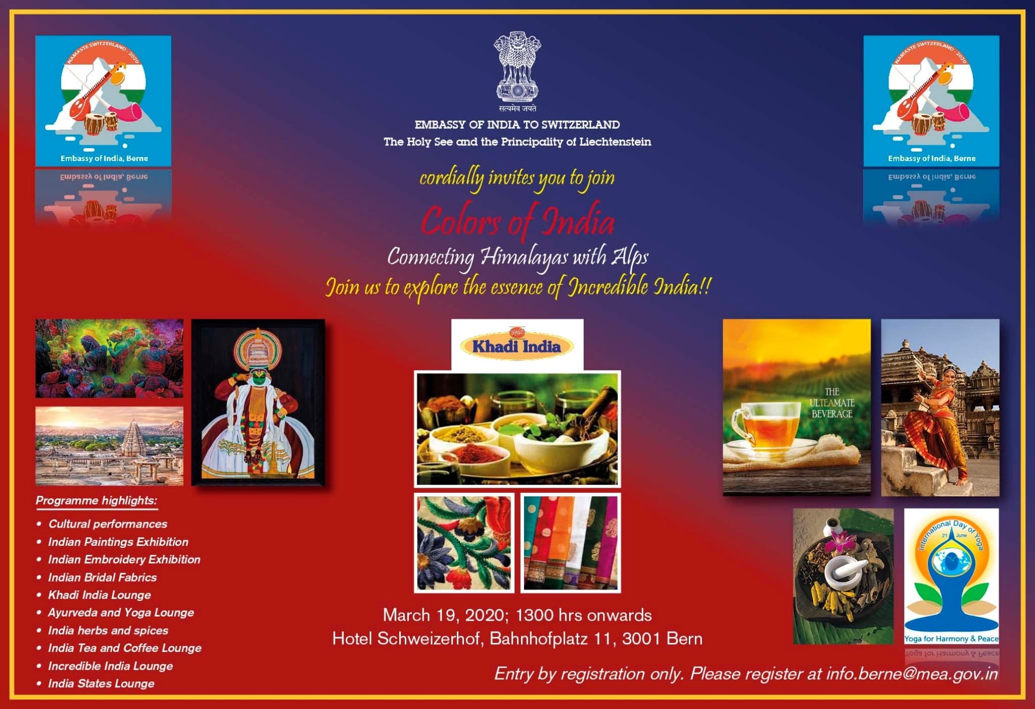 All are invited to join 'Colors of India' - a mega event to explore the essence of ‘Incredible India’ on March 19 at Hotel Schweizerhof in Berne. Please register at info.berne@mea.gov.in.