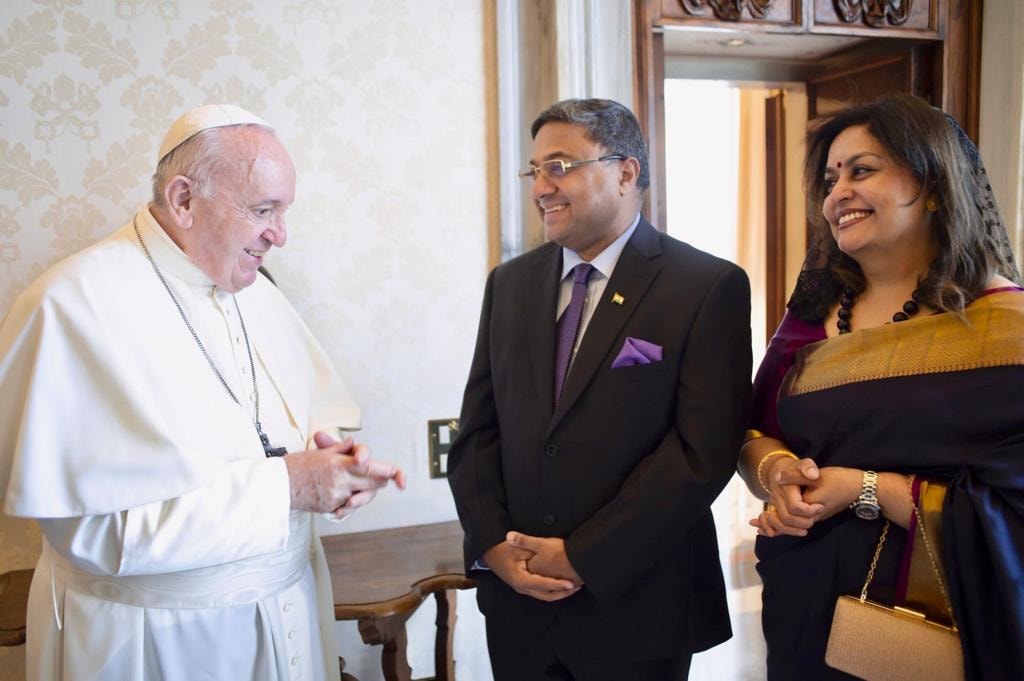 Ambassador Sibi George accompanied by Madam Joice Sibi had a farewell call on His Holiness Pope Francis on June 20, 2020 at Vatican.
