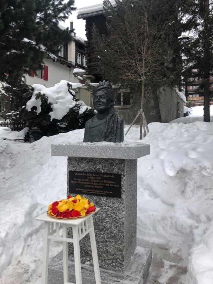 Amb. Monika Kapil Mohta and H.E. Mr. Stefan Zurbriggen, Mayor, Saas-Fee paid floral tributes at the bust of Swami Vivekananda in Saas-Fee on his 158th birth anniversary. Swami ji visited Saas-Fee in 1896.