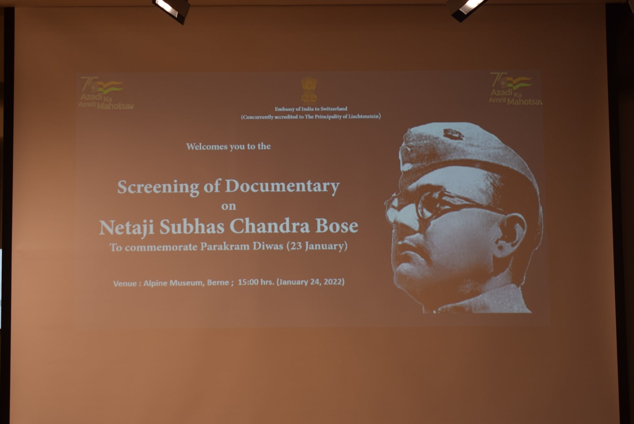As part of Azadi Ka Amrit Mahotsav celebrations, Embassy of India, Berne screened a documentary on life of Netaji Subhas Chandra Bose to commemorate his 125th birth anniversary at Alpine Museum on 24 January, 2022. The documentary highlighted the great leader’s life and his heroic and relentless fight for India’s independence from the British rule.