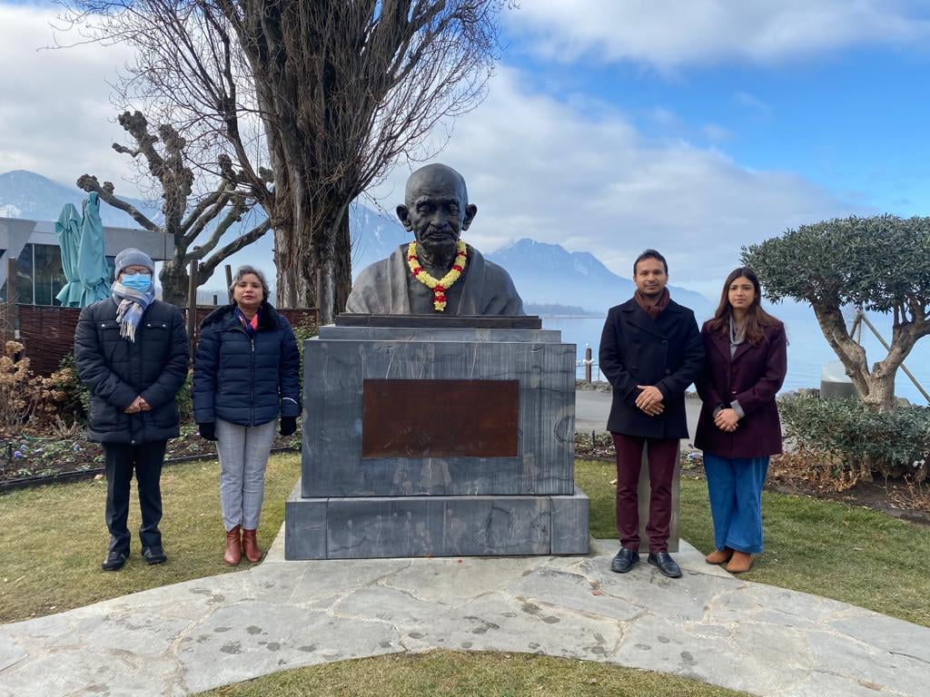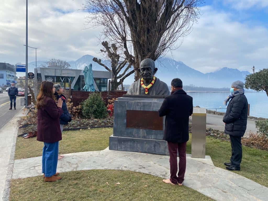 On the occasion of 74th Martyrs Day, homage paid to Mahatma Gandhi at his bust in Villeneuve, Switzerland.