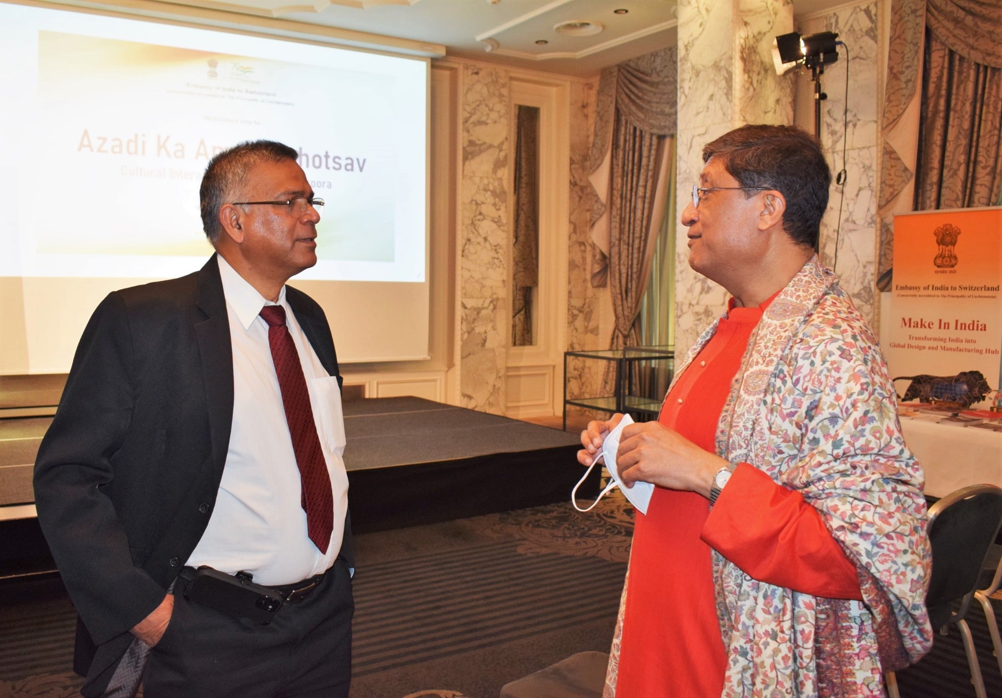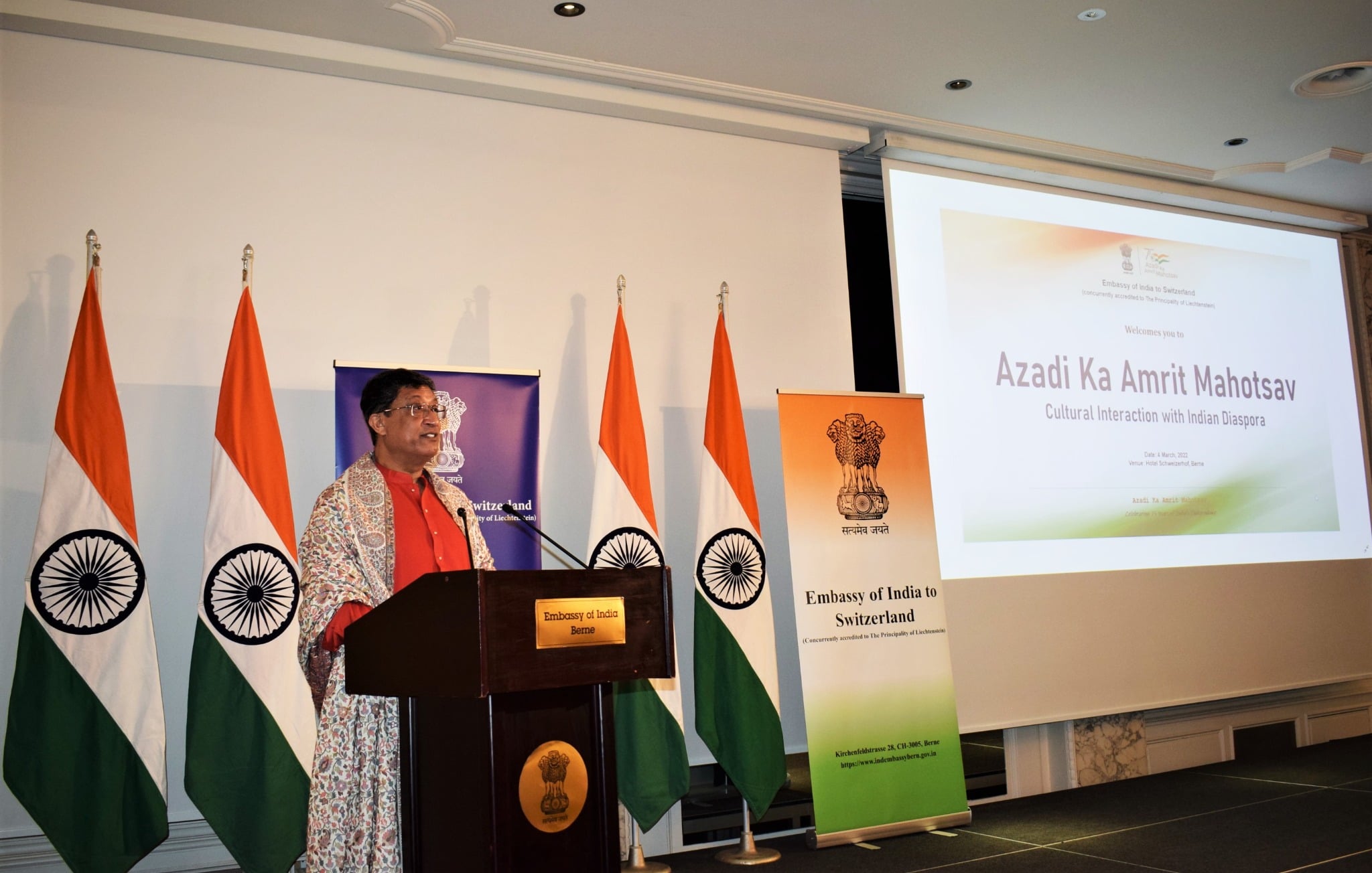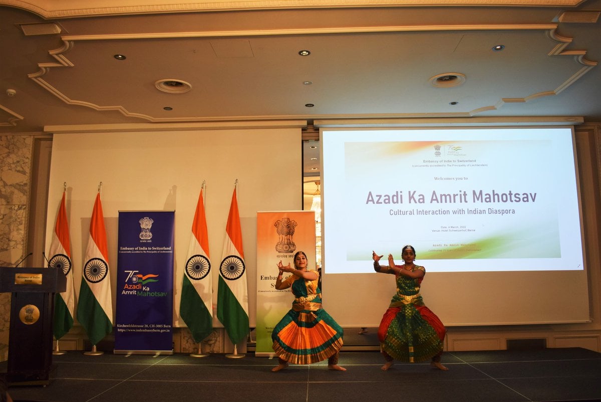 As part of Azadi Ka Amrit Mahotsav celebrations in Berne on 04 March, 2022, Ambassador Sanjay Bhattacharyya inaugurated the event "Cultural Interaction with Indian diaspora" and addressed the gathering. Heads of Indian Diaspora Associations in Switzerland and Liechtenstein and invitees from cultural space attended the event. Bharatanatyam performance by diaspora artistes also formed part of the event.