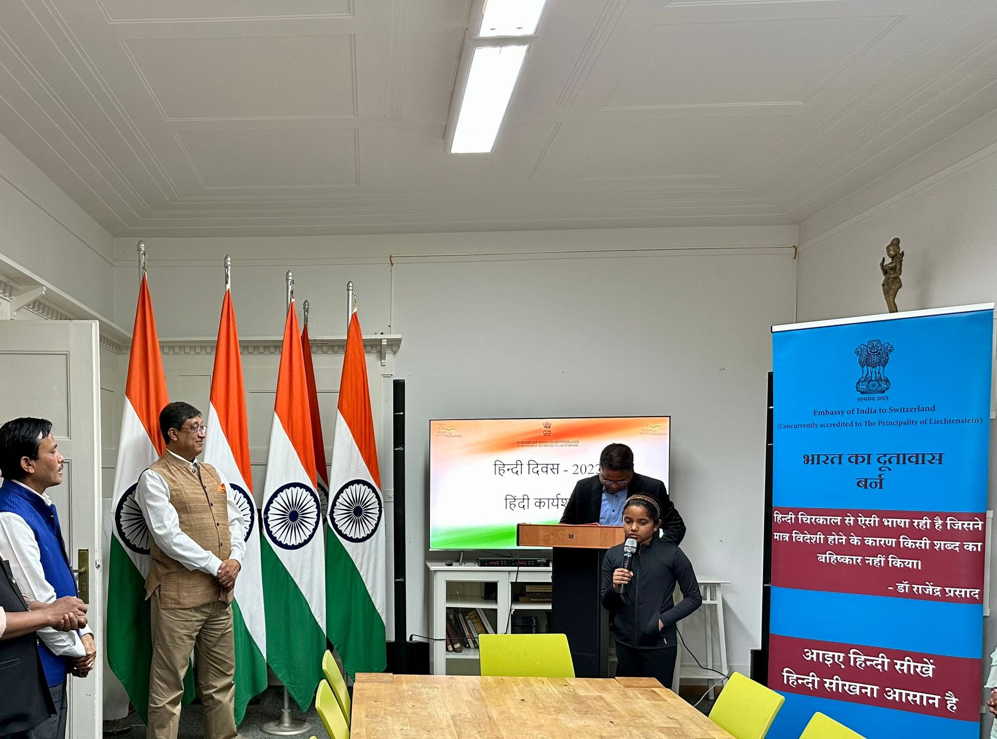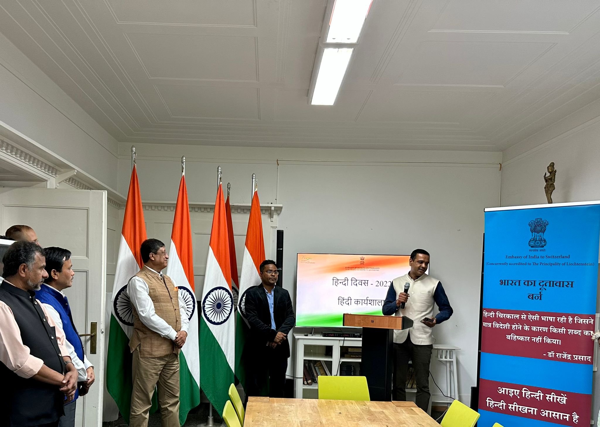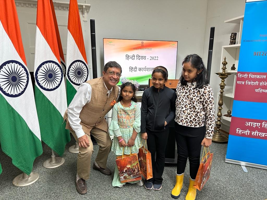 The Embassy of India in Berne organized a Hindi Workshop to celebrate Hindi Diwas on 29 September 2022 at Embassy premises. The Ambassador of India to Switzerland addressed the importance of Hindi. During the event, the message by the Hon’ble Home Minister of India on the occasion of Hindi Diwas was read out. The event also witnessed the enthusiastic participation of Indian Diaspora Children & members of the Mission in the form of a recital of Hindi poetry, songs, and a Quiz.