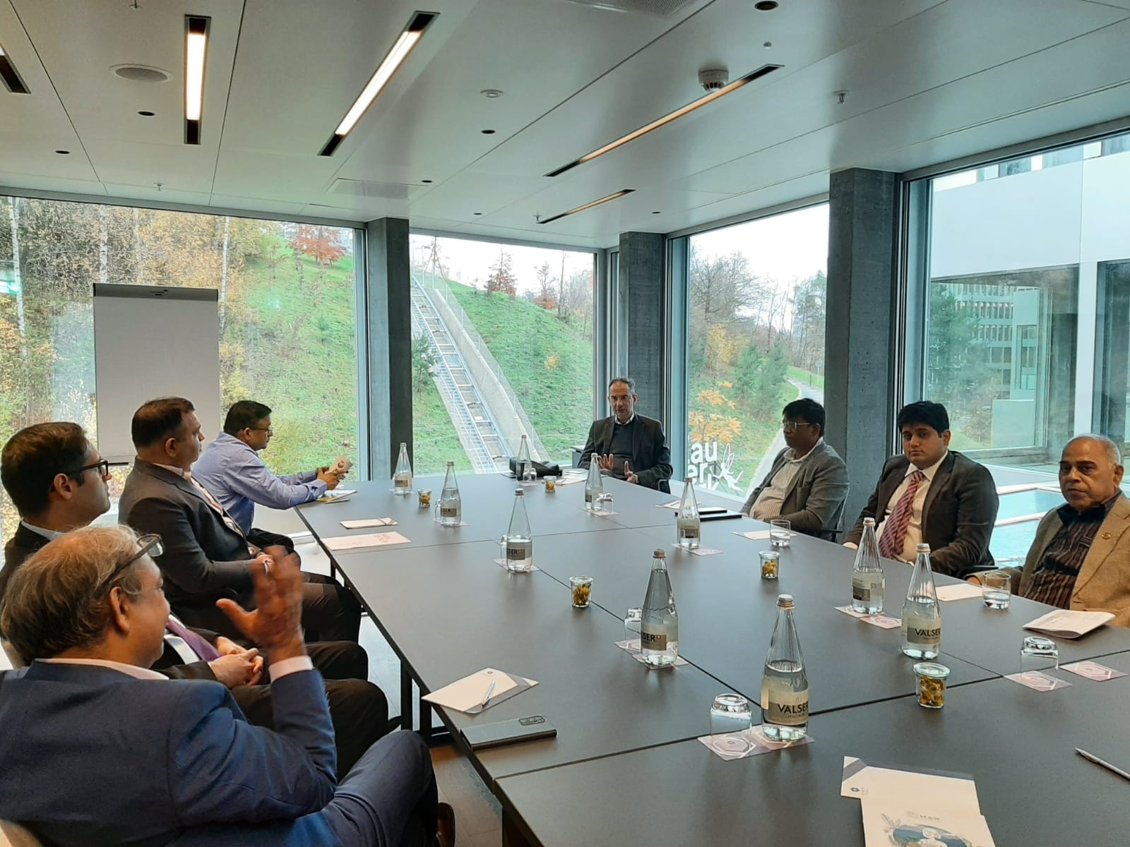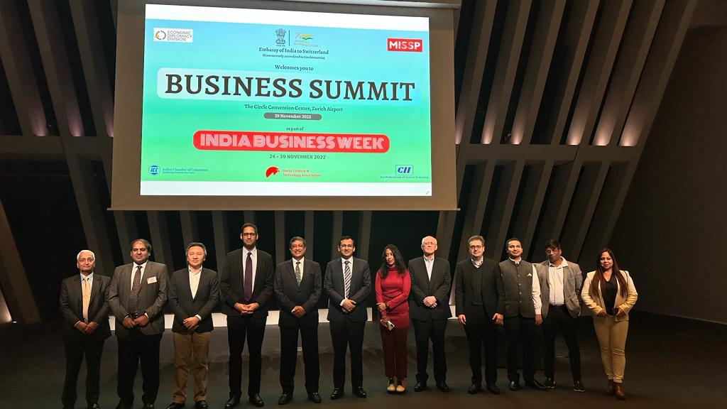 Embassy of India, Berne organised a "Business Summit" at "The Circle Convention Center" on 29.11.2022 during the "India Business Week" and opened the dialogue for cooperation and collaboration between Indian and Swiss SMEs, Industry Associations and Chambers. Speakers from FinTech, BioTech, Robotics and CleanTech sectors in Switzerland made engaging presentations to highlight the latest development in Switzerland. Later all speakers and representatives of textiles, mechanical and electrical engineering industries attended B2B meetings and discussed sustainability, the culture of innovation and creating business opportunities.