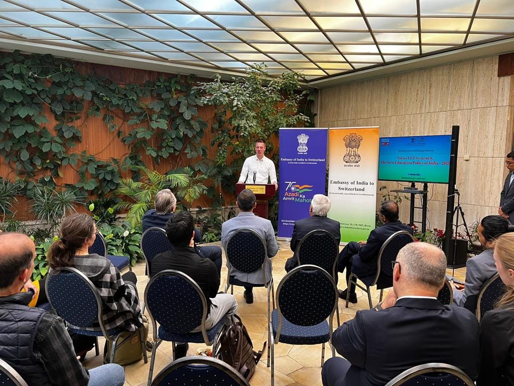 As part of deepening India-Switzerland relations and learning the best practices from Switzerland, which may be optimized in Indian scenario, the Embassy of India, Bern organised an Event ‘Exchanging Views on Swiss VET System & NEP 2020 of India, at India House on 27 Feb 2023. The event aimed and focused  at understanding the Swiss VET system and building partnerships to adapt this system in India, Mission invited students, school teachers, VET trainers and Professors from University of Bern, SFUVET and other institutions to exchange ideas and views on the system’s adaptability in India. The main agenda of the event was:
