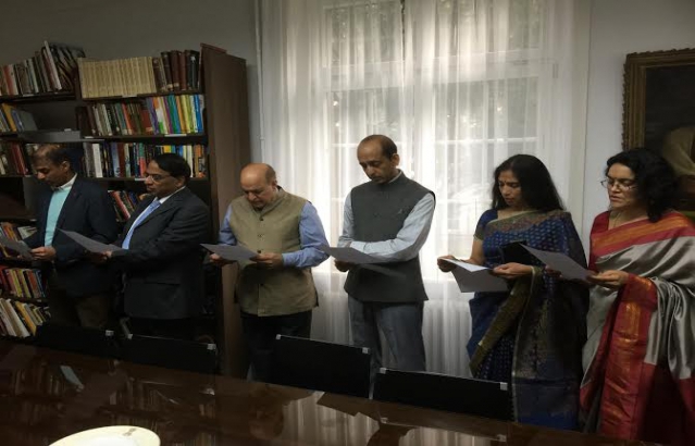 The 125th birth anniversary of Babasaheb Dr. B.R. Ambedkar, who wrote India’s Constitution, was commemorated at the refurbished library-cum-conference room of the Chancery - on 14th April 2016. We were glad to welcome prominent members of the Indian community, officials and their family members. Ambassador addressed the audience on the life and achievements of Babasaheb, which were diverse and spanned many areas. His life and struggles give inspiration to countless millions. Dr. Ambedkar prevailed over all kinds of adversity to achieve great heights. He resisted attempts by the colonial rulers to divide the movement for Independence. He was a great scholar and the author of India’s Constitution, which is unique. The fact that Indian democracy continues to thrive owes a lot to his vision and wisdom. The Preamble of the Constitution was recited by all and some of his important quotes were also read out by Shri P. Mukherjee, Second Secretary (Culture & Inf.), Indian Embassy A documentary on Dr. Ambedkar (directed by eminent filmmaker Dr. Jabbar Patel) was screened. People can read about his extraordinary life, his scholarly achievements, his struggle against prejudice, and the social reform movements he led on the web. We were glad for this occasion.