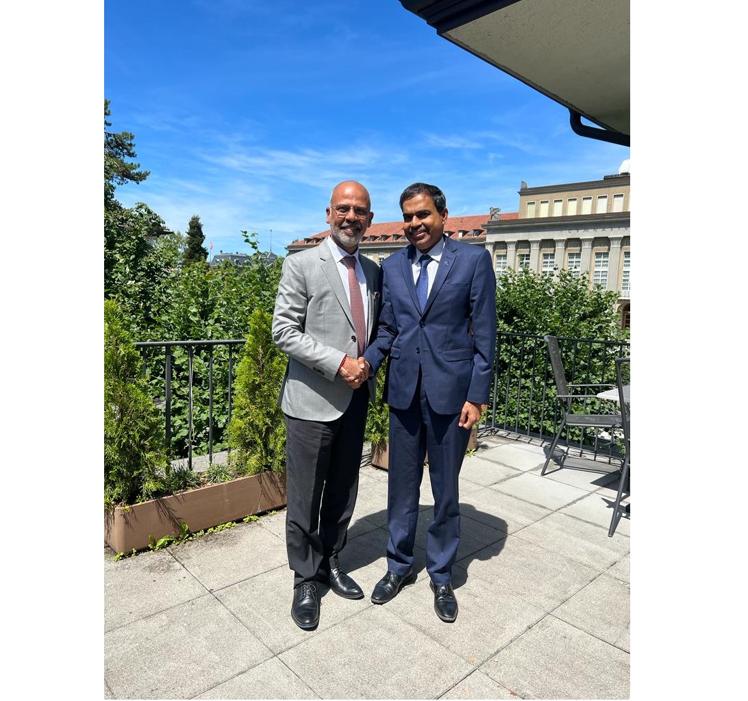 Ambassador Mridul Kumar received Thakur Subhash Sinha, Coordinator, Asia-Pacific and South-South Cooperation, UPU at his office in Bern on 31 July 2023. Matters of mutual interest were discussed during the meeting.