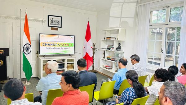 Officials of Embassy of India, Berne witnessed the joyous and proud moment of India becoming the first country in the world to successfully soft land a probe near moon’s South pole on 23 August 2023 at the Chancery and rejoiced the history created by scientists at Indian Space Research Organization (ISRO).
