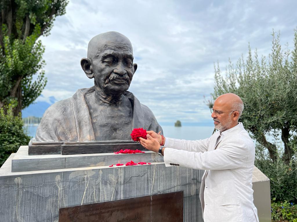 Floral tributes by Ambassador Mridul Kumar on Mahatma Gandhi’s statue at Villeneuve on 21 September 2023