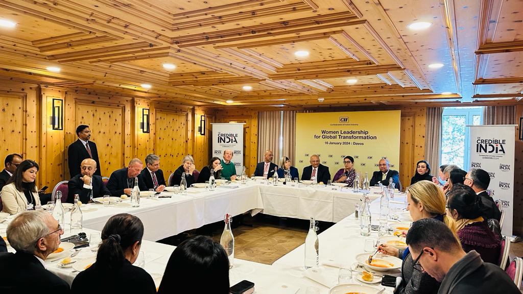 Ambassador Mridul Kumar along with Hon’ble Minister Ms. Smriti Zubin Irani and CII leadership held lively discussions on “Women leadership for global transformation” at the luncheon meeting hosted on the margins of World Economic Forum in Davos on 16 January 2024.