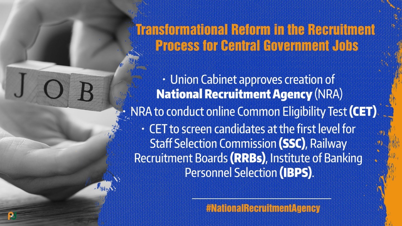 Cabinet approves setting up of National Recruitment Agency (NRA) to conduct the Common Eligibility Test (CET)