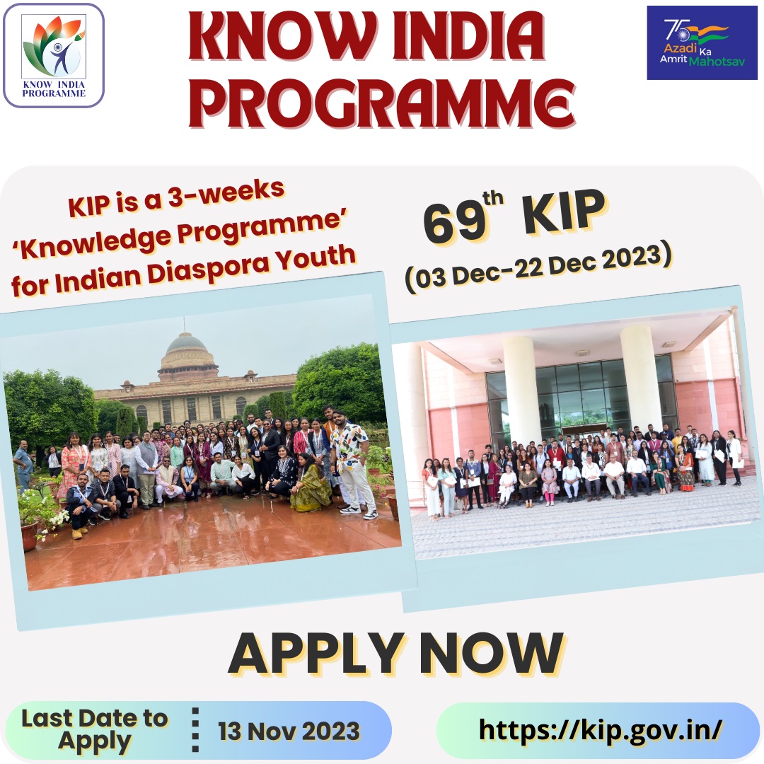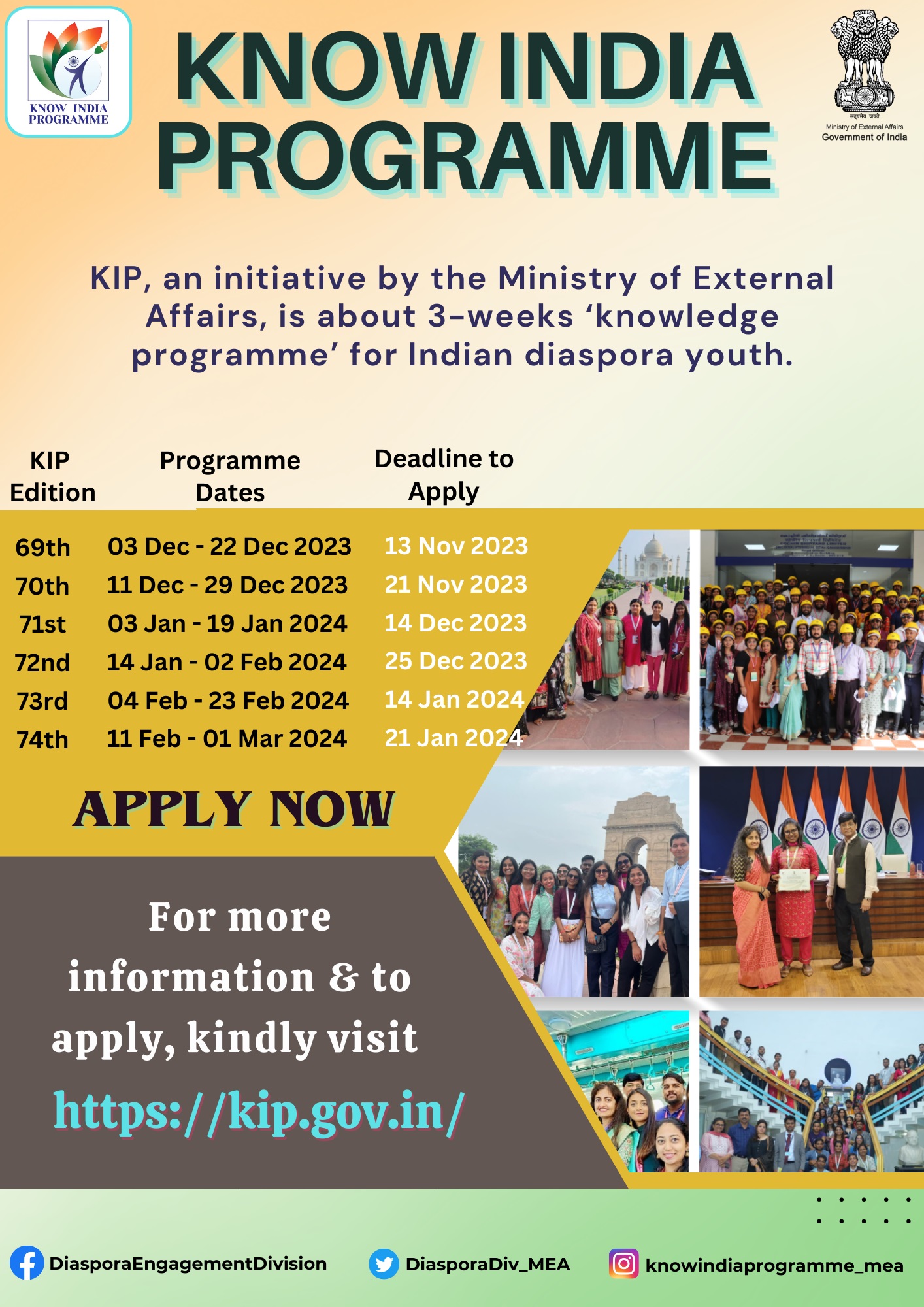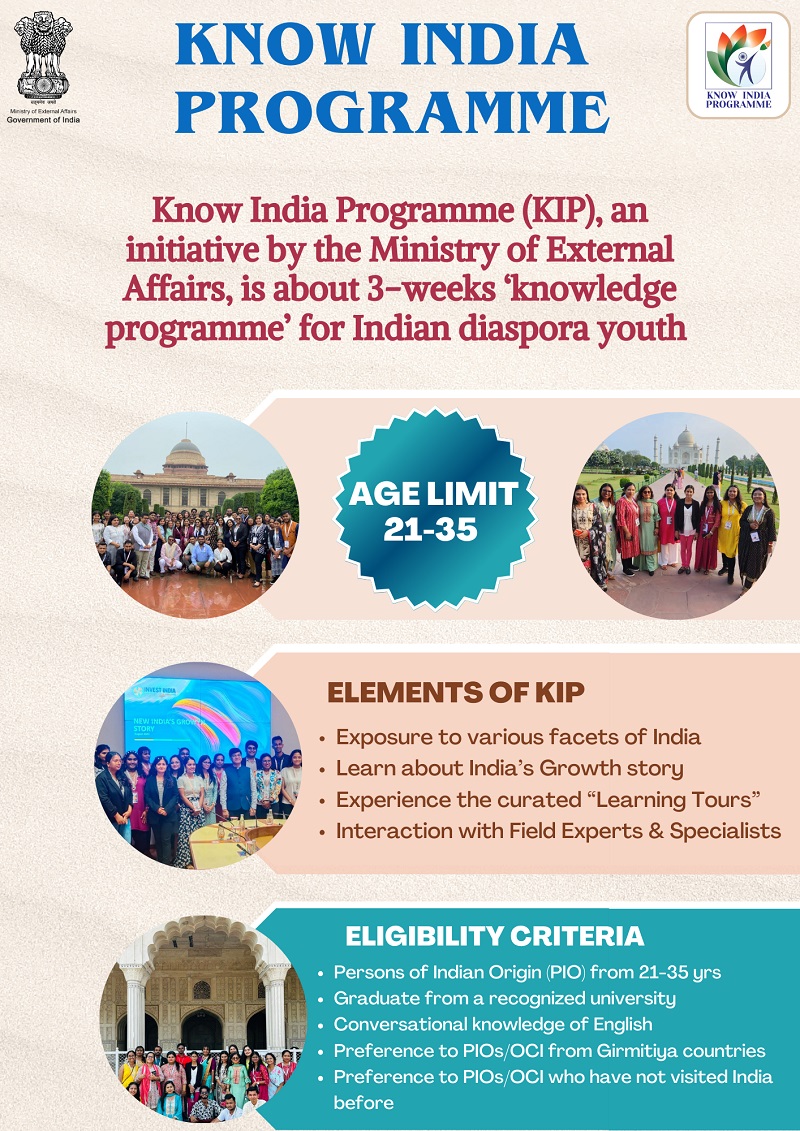 The Ministry of External Affairs, Government of India, New Delhi is organizing “Know India Programmes” (KIP), which is a three-week orientation programme for diaspora youth, with a view to promote awareness on different facets of life in India and the progress made by the country in various fields e.g. economic, industrial, education, science & technology, communication & information Technology, culture. KIP provide a unique forum for students & young professionals of Indian origin to visit India, share their views, expectations & experiences and to develop closer bonds to strengthen engagement with young overseas Indians with accomplishments in various fields like politics, economics, industry, art & culture, technology, etc. KIP will be for duration of 3 - week, the Programme includes visit to one or more State (s) showcasing culture & heritage, and India’s strength in diverse sectors such as science & research, manufacturing and services.