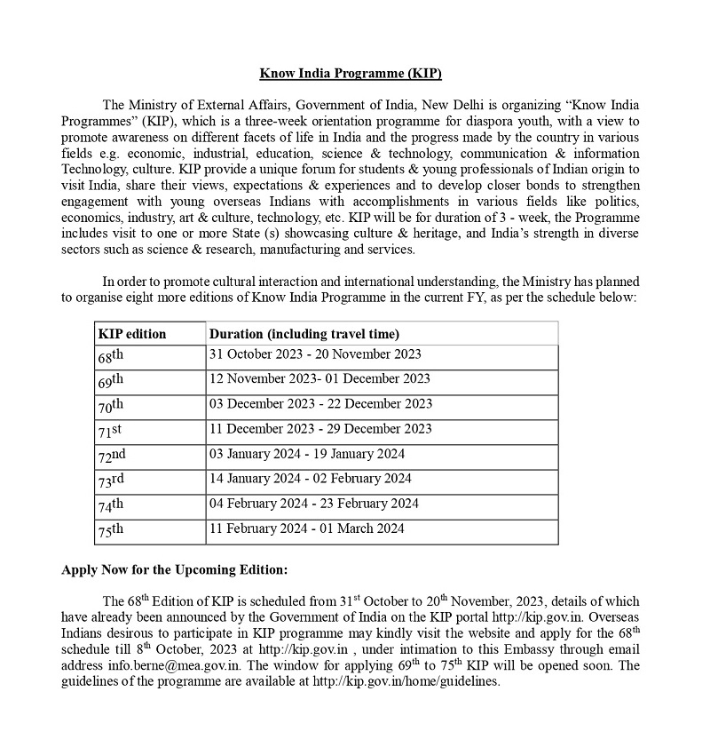 Overseas Indians desirous to participate in KIP programme may kindly visit the website and apply for the KIP editions at http://kip.gov.in, under intimation to this Embassy through email address info.berne@mea.gov.in.