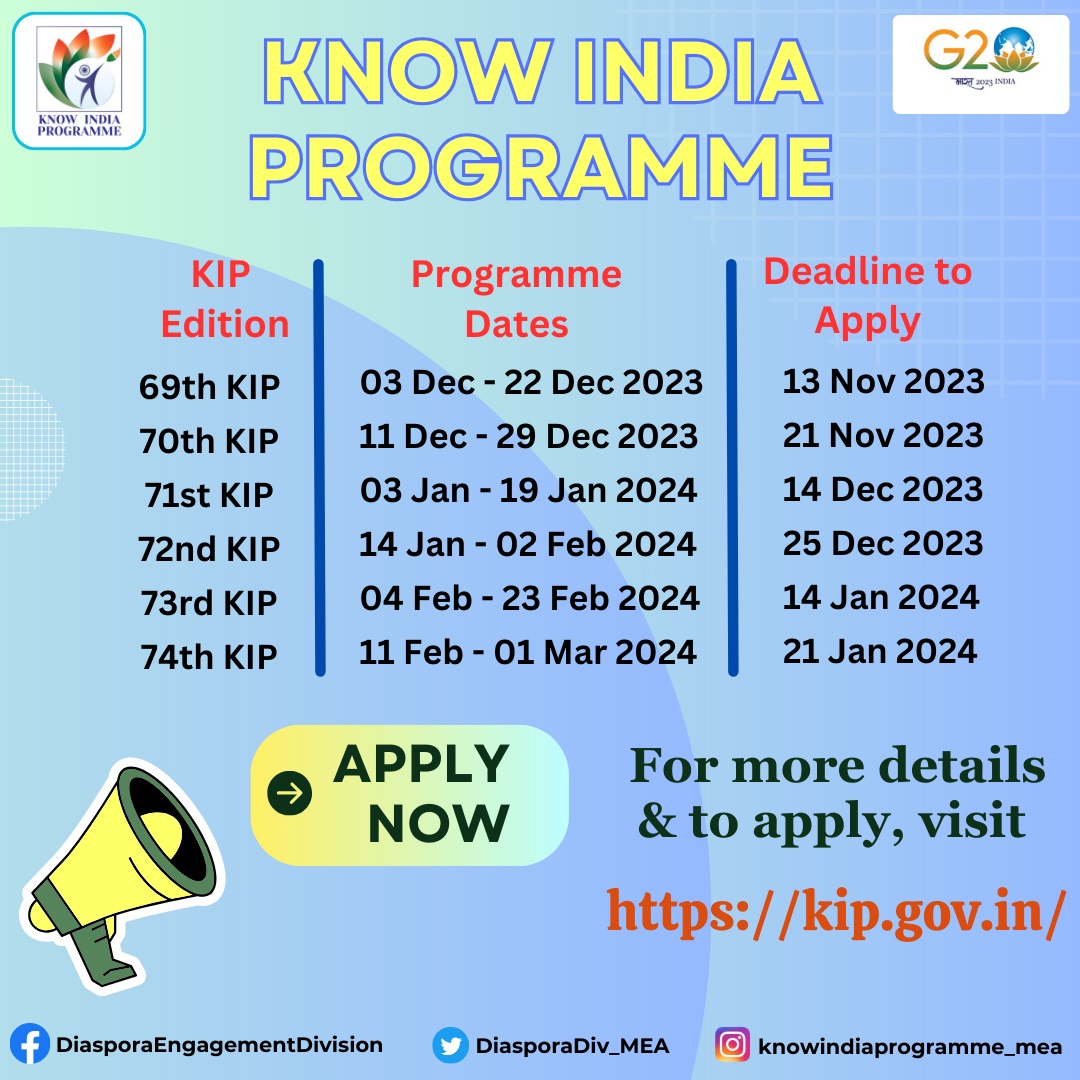 In order to promote cultural interaction and international understanding, the Ministry has planned to organise eight more editions of Know India Programme in the current FY, as per the schedule below:
