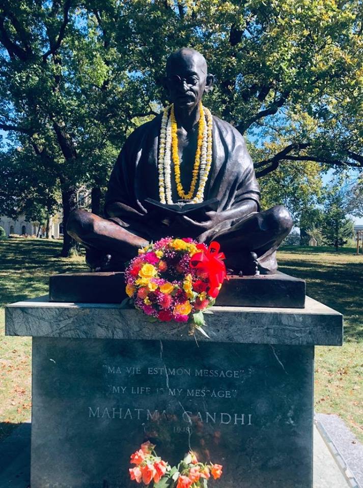 Officials of Embassy of India to Switzerland, The Holy See & Lichtenstein paying floral tributes at the statue of Mahatma Gandhi at Ariana Park, Geneva, Switzerland. On his 150th birth anniversary, Embassy will be holding events in various cities of Switzerland.
