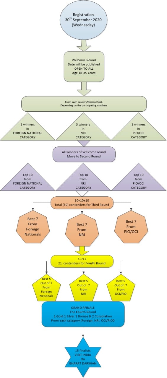 2. The 3rd edition of ‘Bharat Ko Janiye’ Quiz will be organized completely online and will have  four rounds. The Quiz will be held for three categories of participants – Persons of Indian Origin (PIO), Non-Resident Indians (NRIs) and foreign nationals [in the age group of 18-35 years]. The 1st  Round (Welcome Round) will be open for everyone in the above mentioned categories. Winners of 1st Round will be given Gold, Silver and Bronze medals in each country depending upon number of participants. They will also be eligible to participate in the 2nd Round. The top 10 winners of the 2nd Round will participate in the 3rd Round (30-participants). The top 7 winners of the 3rd  Round will participate in the 4th Round (21 participants). Top 5 contestants of 4th Round will be awarded Gold, Silver and Bronze medals with two Consolation prizes. These 15 winners will be invited to India for Bharat Darshan after COVID. Information Flyer and Quiz flow chart are enclosed.