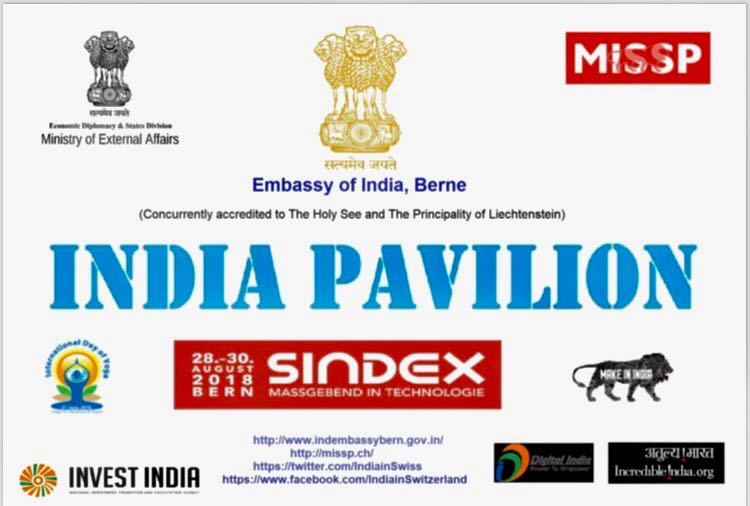 INDIA PAVILION at SINDEX 2018: Embassy of India, Berne is participating in SINDEX Trade Fair in Berne, Switzerland from 28-30 Aug. All are welcome to visit India Pavilion (Hall 3.2, Stand C30)