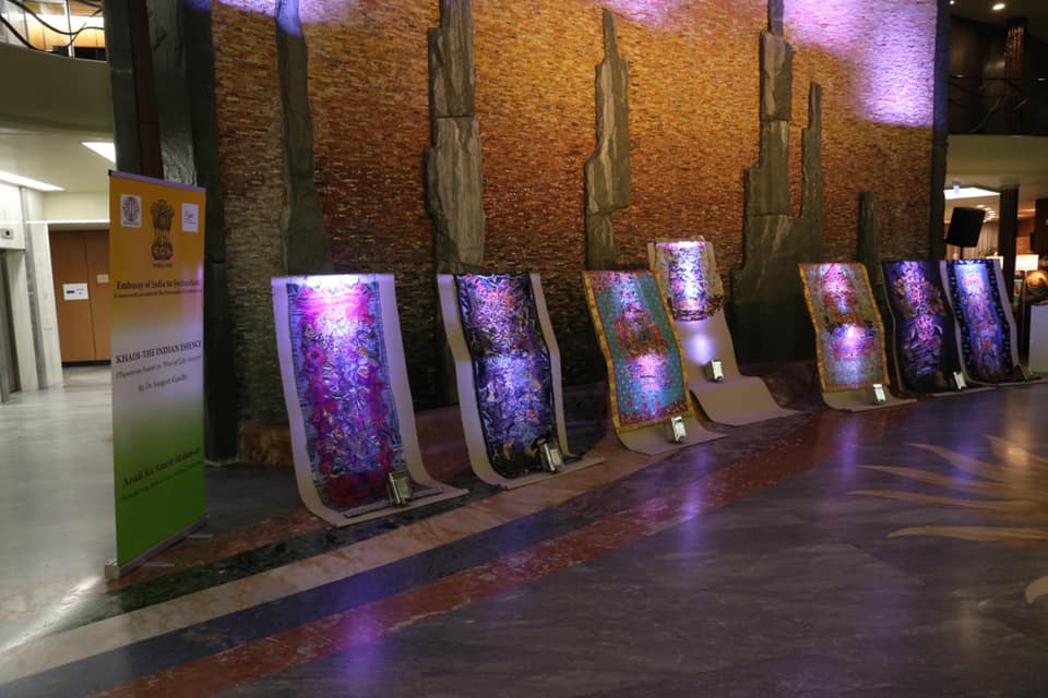 Mission organised ICCR sponsored Khadi tapestry exhibition by eminent artist Dr. Sangeet Gandhi in Geneva and Zurich on 29 September, 2021 and 30 September 2021 respectively as part of Azadi Ka Amrit Mahotsav celebrations. The exhibition was based on the theme “Khadi – The Indian Essence”. In Geneva, the event was attended by prominent leaders of International Organizations based in Geneva, diplomats from various Missions, members of Indian diaspora and the local Swiss community. At Zurich, the exhibition was inaugurated by Minister of State for External Affairs Smt. Meenakashi Lekhi and was attended by leading members of the Indian diaspora in both cultural and commercial space.