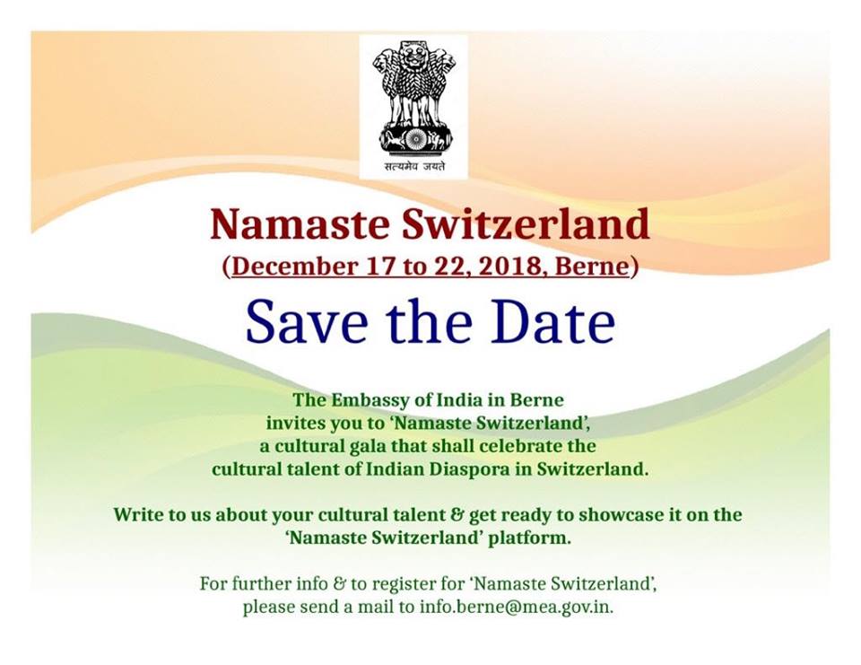 Save the date for Namaste Switzerland- a Cultural gala that shall celebrate the talent of Indian Diaspora in SwitzerlandDec 17 - 22, 2018.