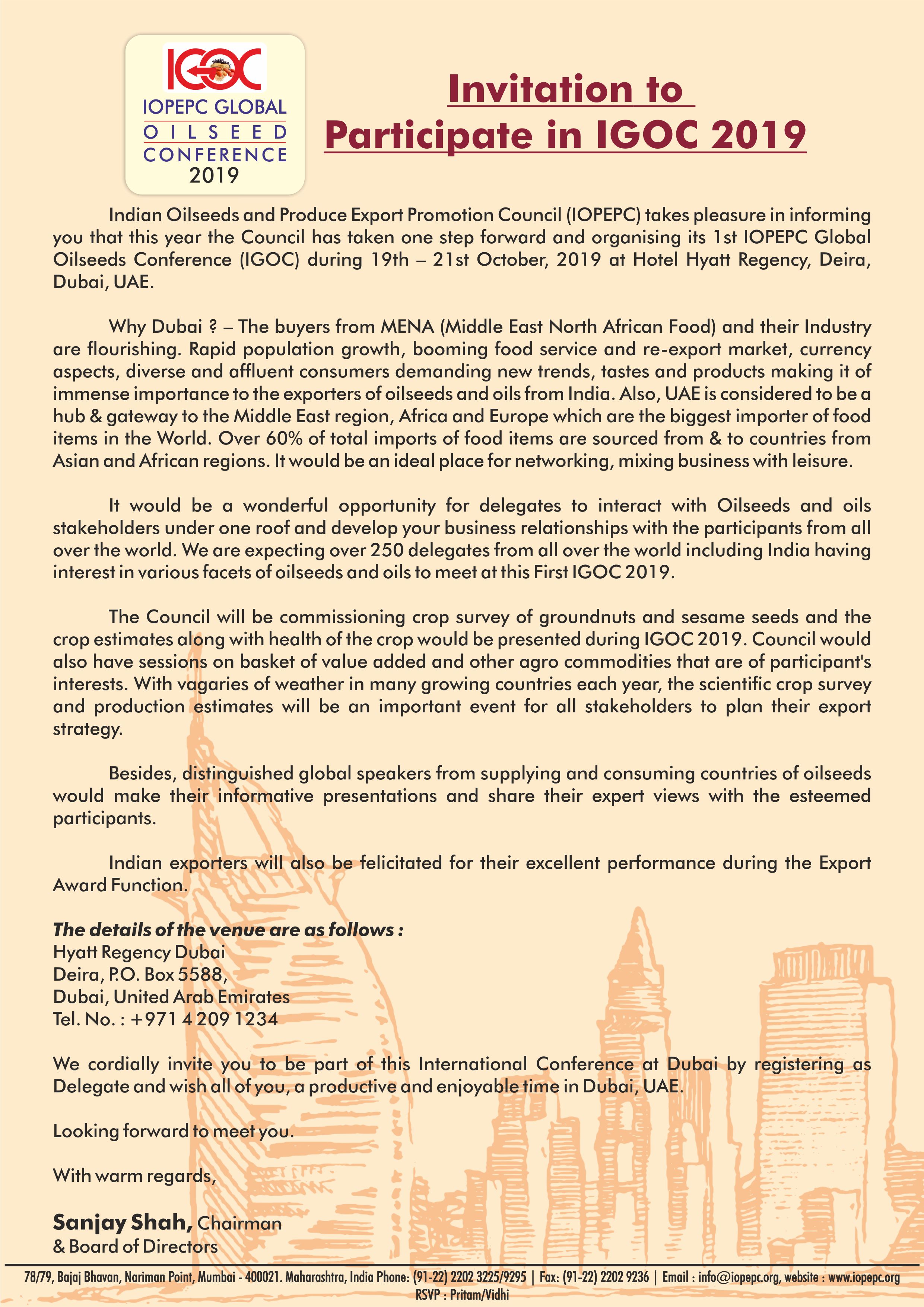 1st IOPEPC Global Oil seeds Conference (IGOC) during 19th – 21st October, 2019 at Hotel Hyatt Regency, Deira, Dubai